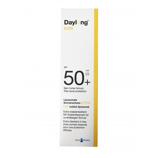 La Lotion Solaire SPF 50 Daylong Kids est aux liposomes, sans parfum et extra rĂ©sistante Ă l’eau. Pratique, le flacon-pompe permet de bien doser la crème.