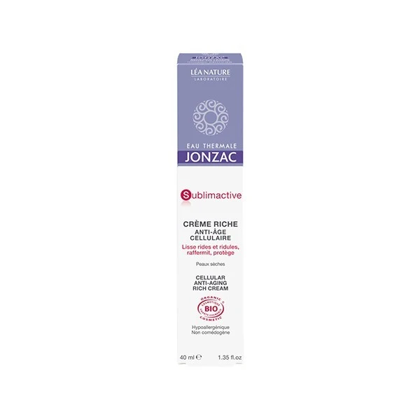 Eau de Jonzac Sublimactive Crème Riche Jeunesse Immédiate 40 ml prévient et corrige les signes de vieillissement cutané agissant sur les rides, ridules et la perte de fermeté. Idéale pour les peaux matures sèches, elle est riche en Eau Thermale de Jonzac (25%) aux propriétés apaisantes et anti-irritantes. Les résultats sont rapidement visibles : la peau est lissée (91%*), les rides et ridules sont atténuées (77%*), la peau est raffermie (90%*). Certifiée bio par Ecocert. Hypoallergénique. Non comédogène. 99% du total des ingrédients sont d’origine naturelle. 31% du total des ingrédients sont d’origine biologique. * Test réalisé sur 21 sujets pendant 28 jours.