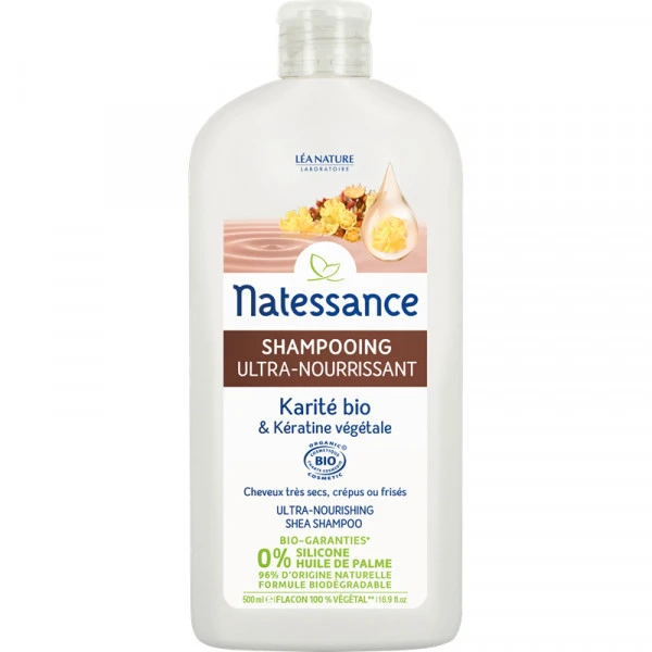Enrichi en beurre de karité bio, reconnu pour apporter nutrition et brillance aux cheveux, ce shampooing nettoie délicatement les cheveux difficiles à coiffer.