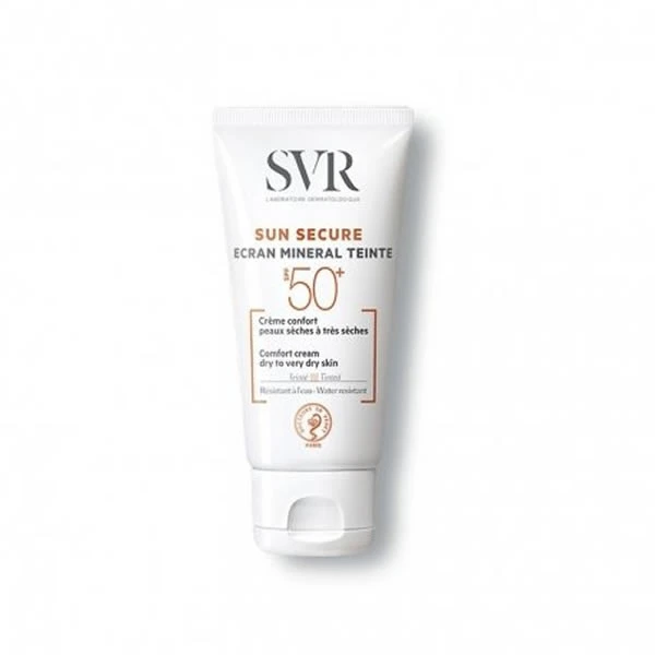 SUN SECURE Écran Minéral Teinté SPF50+ est un soin qui allie très haute protection SPF50+ 100% minérale et maquillage. Il convient aux peaux intolérantes mais aussi aux femmes qui souhaitent se maquiller au soleil toute l’année. Grâce à sa bonne couvrance, les imperfections sont camouflées, le teint unifié toute la journée. Il existe en deux versions : crème toucher sec peaux normales à mixtes et crème confort peaux sèches à très sèches.